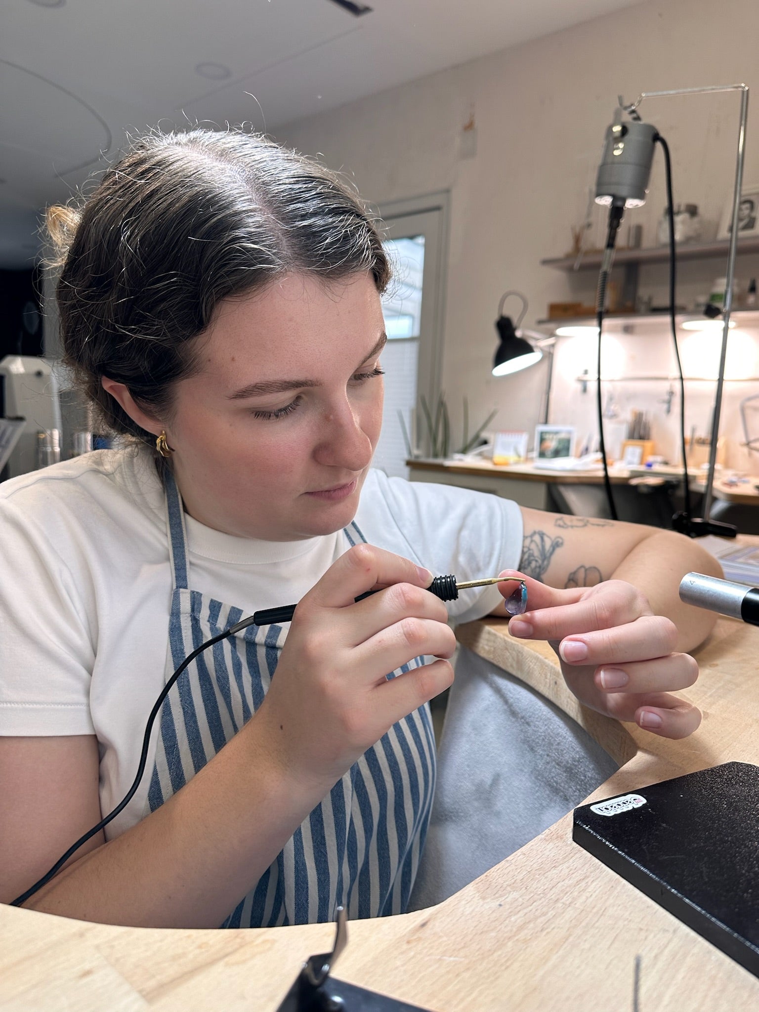 Most days, you’ll find me carving in my studio with a fantasy audiobook playing in the background. At home, I photograph the jewelry, update the website, and pack each order by hand, with my cat Fynn and too many plants keeping me company.